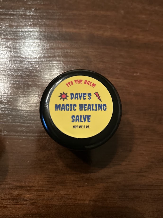 Dave’s Magic Healing Salve: 2.2oz. $6.00 Made from 100% Pure beeswax and all natural products. Great for dry skin and moisturizing. I use it daily and no longer have issues with eczema. This product has not been approved by any medical study or the FDA.